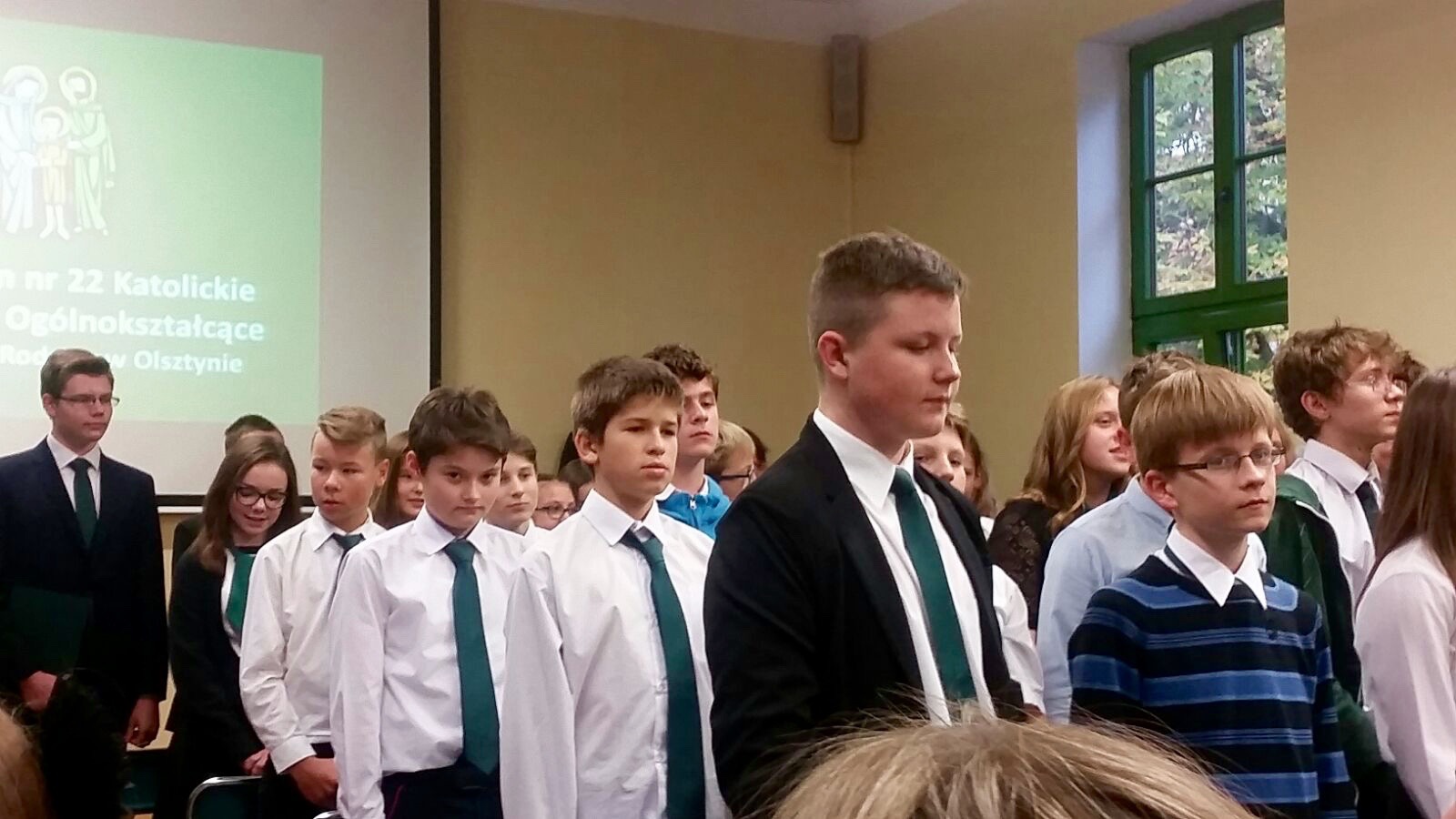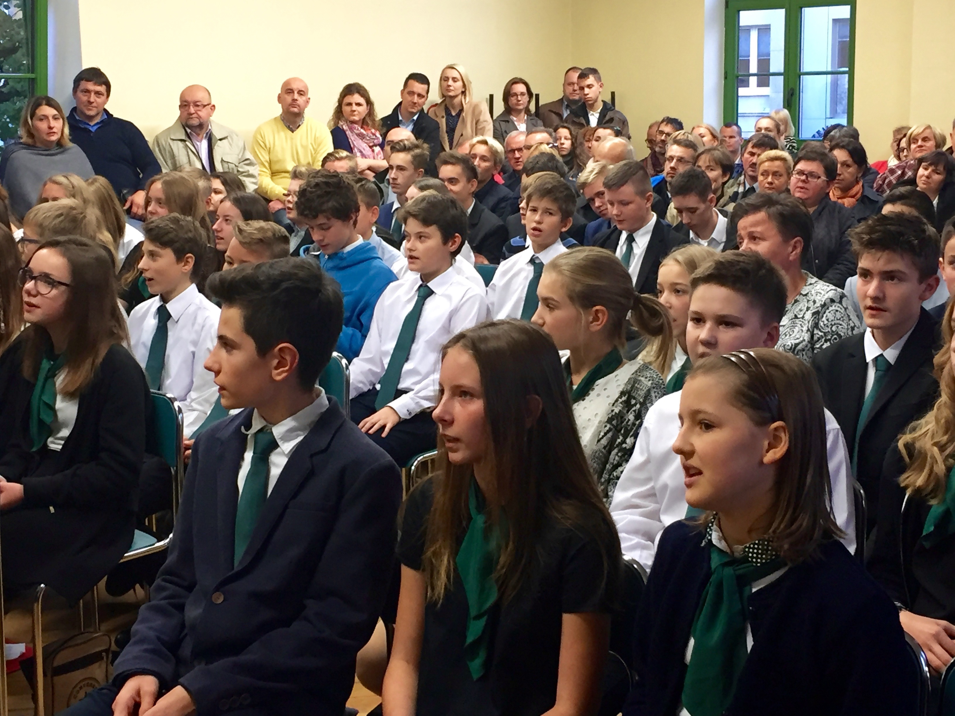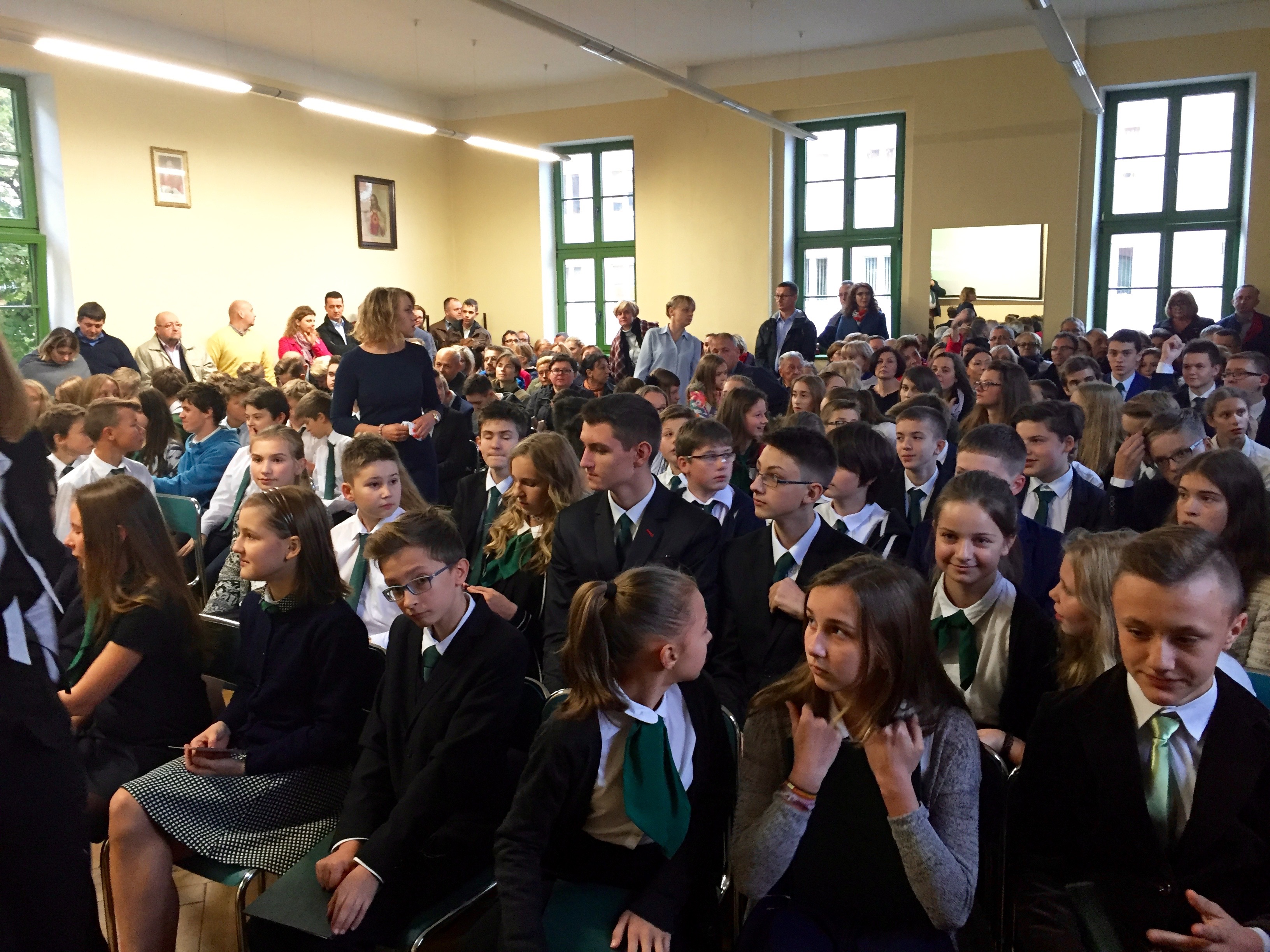 Zaraz po ślubowaniu, uczniowie, rodzice i nauczyciele zostali zaproszeni do szkolnej auli na krótki historyczny montaż słowno-muzyczny. Po intelektualnej uczcie udaliśmy się do szkolnych sal, gdzie można było najeść się do syta, mimo, że posiłki postne to różnorodność każdego zachwycały.