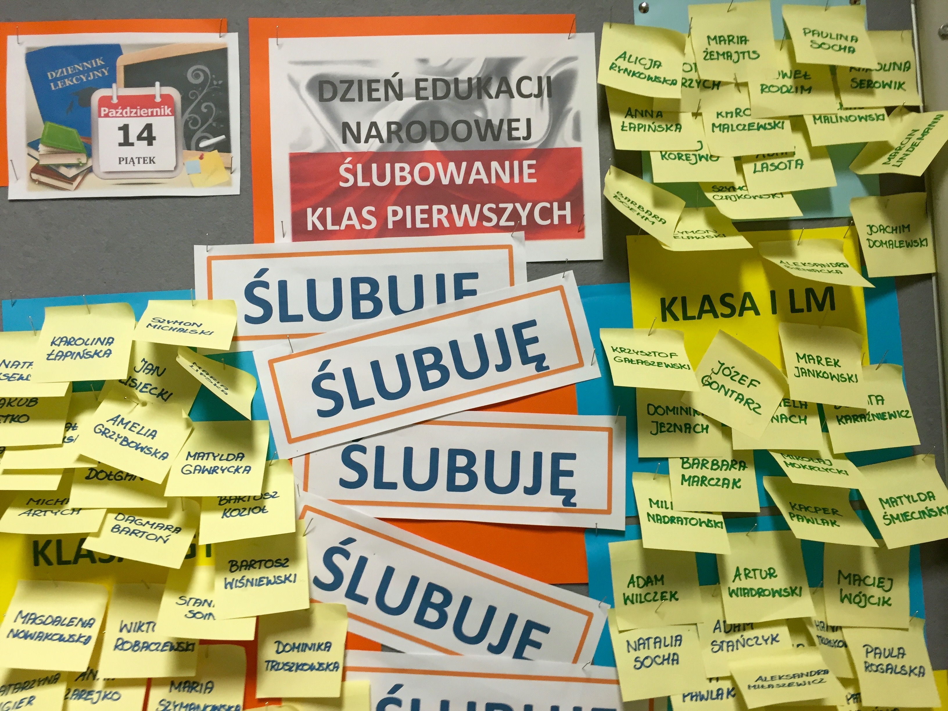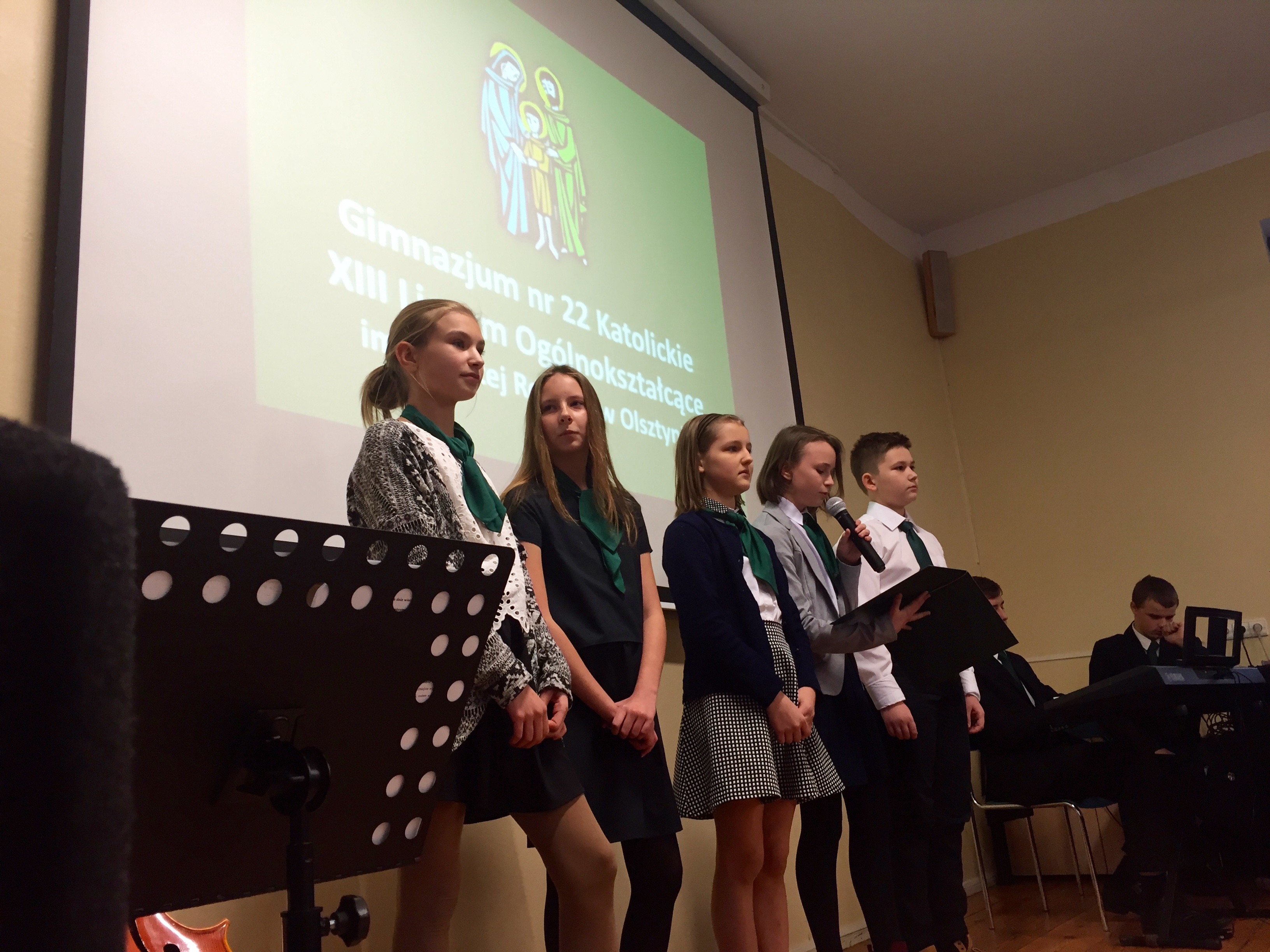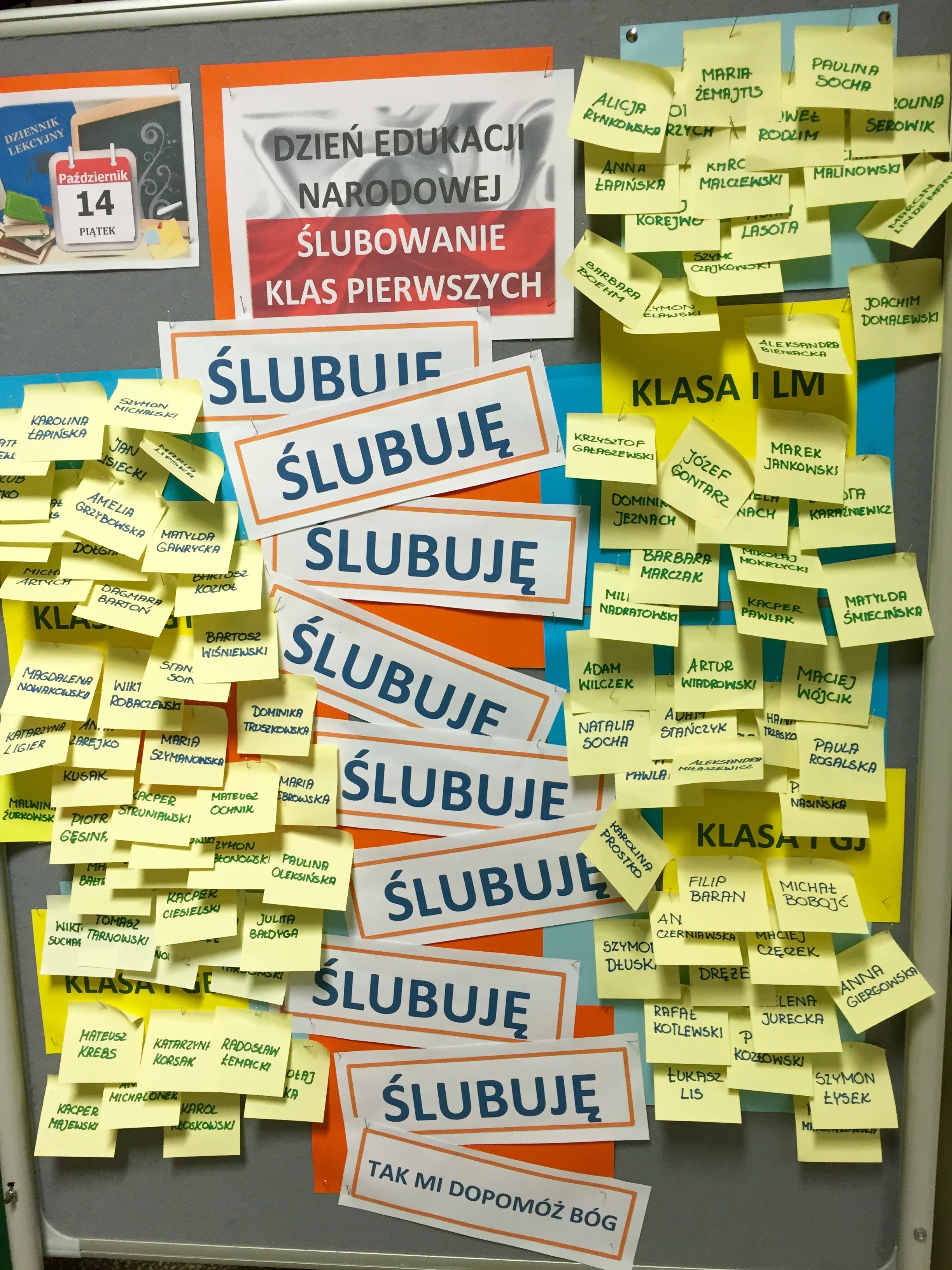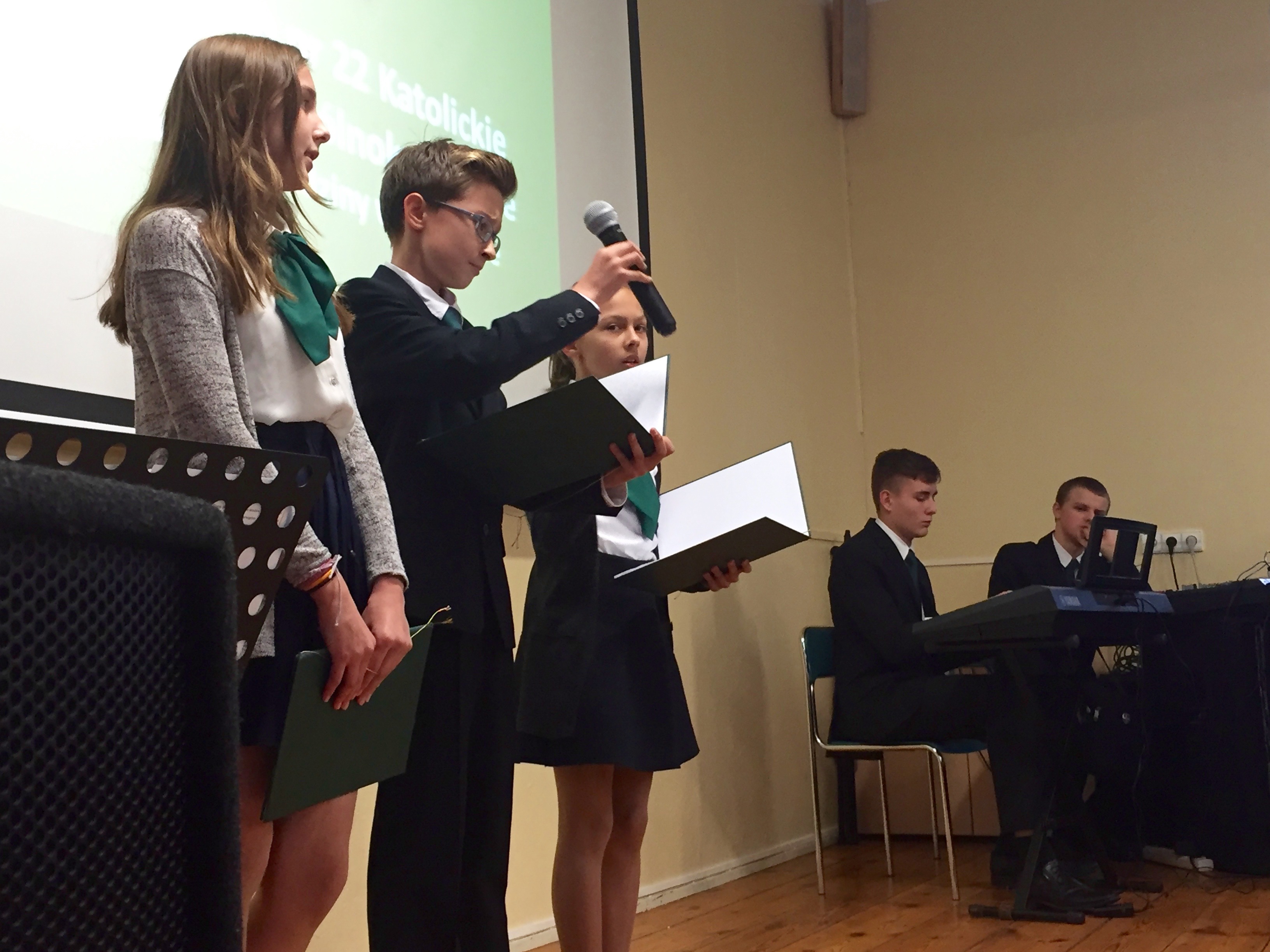 Zaraz po ślubowaniu, uczniowie, rodzice i nauczyciele zostali zaproszeni do szkolnej auli na krótki historyczny montaż słowno-muzyczny. Po intelektualnej uczcie udaliśmy się do szkolnych sal, gdzie można było najeść się do syta, mimo, że posiłki postne to różnorodność każdego zachwycały.