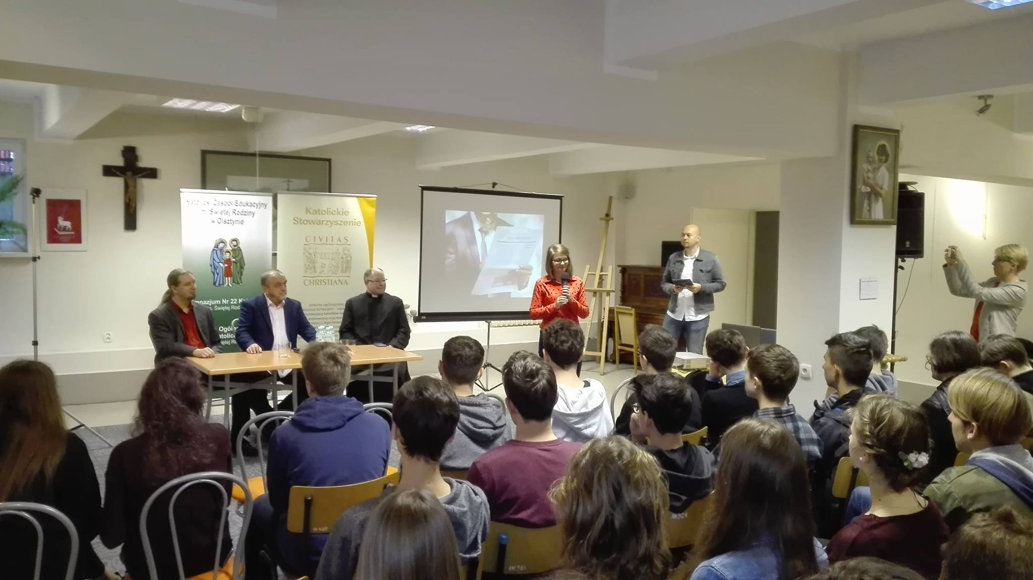 W dniu dzisiejszym (29 września) w ramach godziny formacyjnej dla uczniów Liceum odbyła się pierwsza z cyklu trzech debat, w których poruszane będą problemy bliskie społeczeństwu. Dzisiejsza debata odbyła się pod tytułem „Po co nam media?”. Wzięli w niej udział eksperci – profesor Krzysztof Szatrawski, kulturoznawca z UWM, Patryk Pulikowski, rzecznik olsztyńskiego ratusza oraz ksiądz Piotr Sroga, asystent kościelny olsztyńskiej edycji Gościa Niedzielnego – Posłaniec Warmiński. Spotkanie poprowadził redaktor Marek Jarmołowicz.