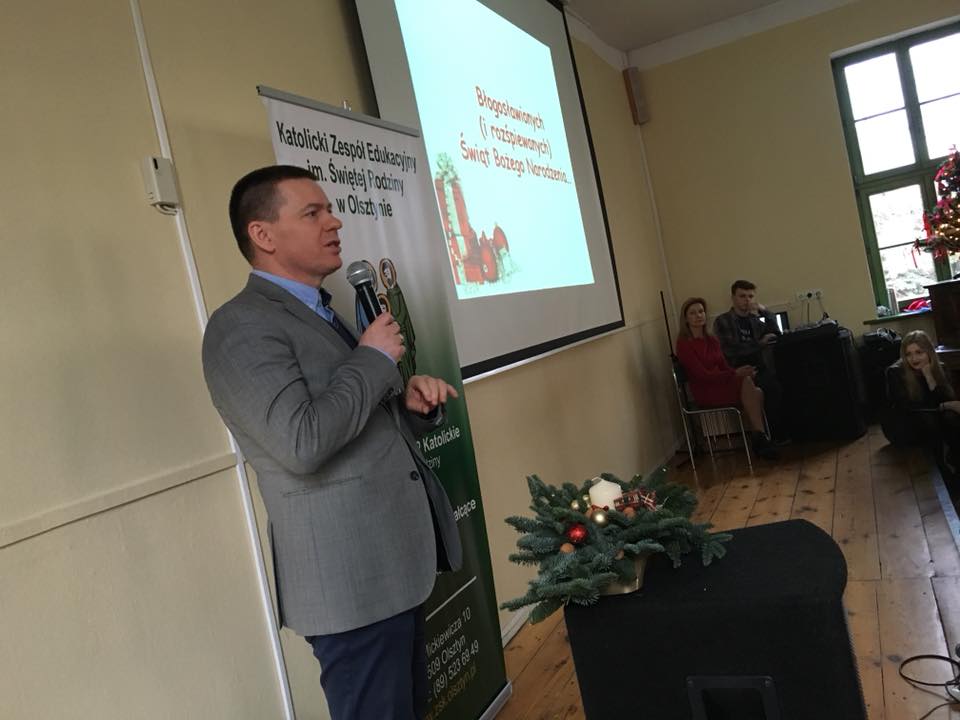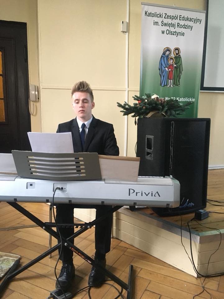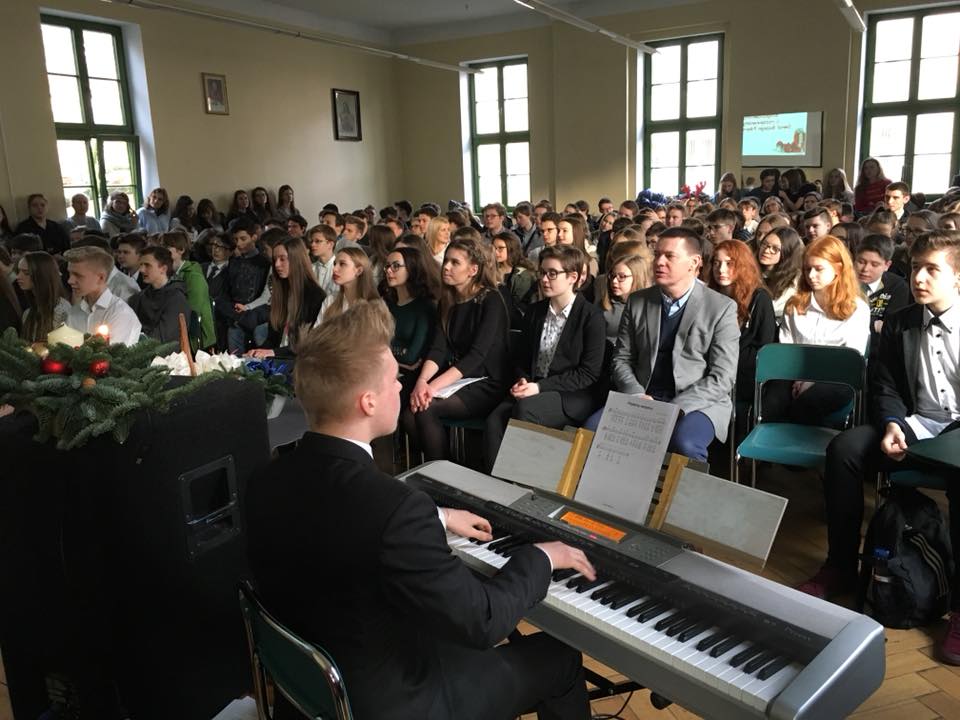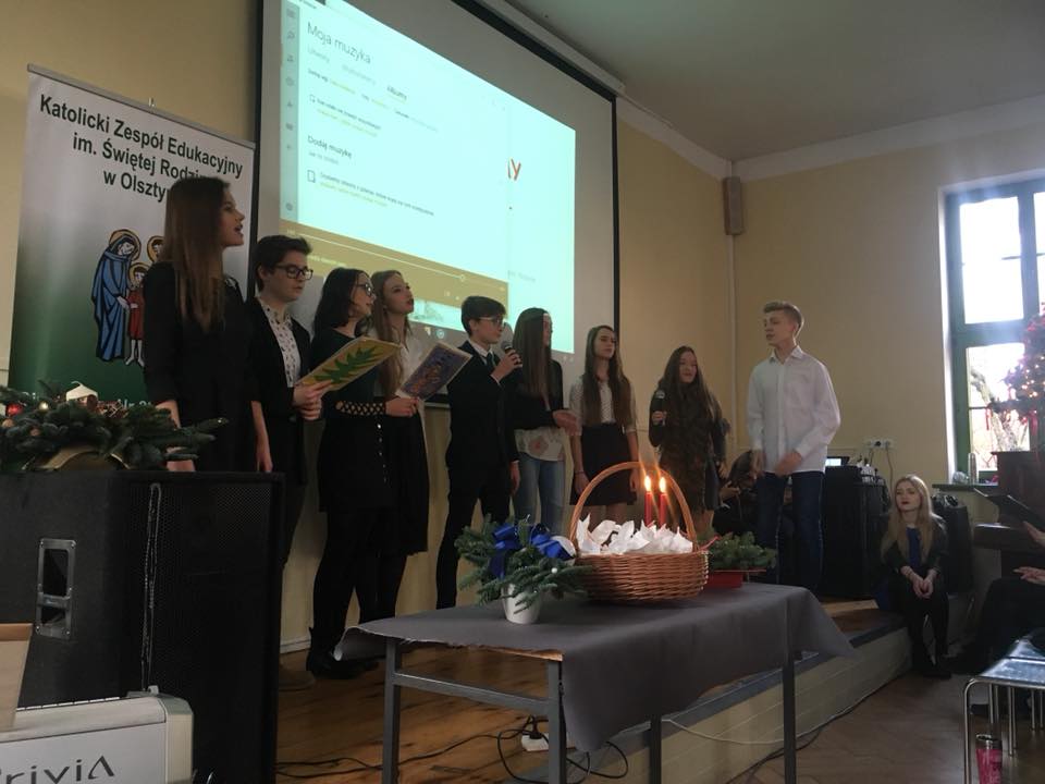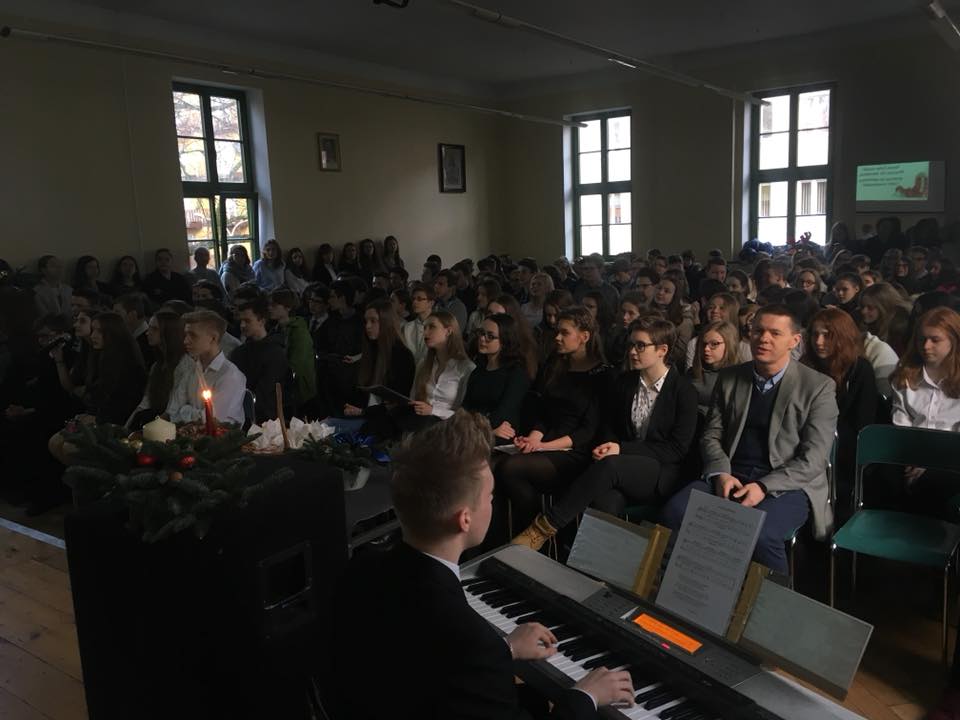 Całą wspólnotą szkolną spotkaliśmy się na Wigilii szkolnej. Chór pod opieką Pani Ani Szybanow zainicjował kolędy, które zachęciły nas do wspólnego śpiewania. Atmosfera była bardzo radosna. Usłyszeliśmy wiele wspaniałych życzeń. Po części artystycznej udaliśmy się do klas, gdzie w mniejszym gronie połamaliśmy się opłatkiem.