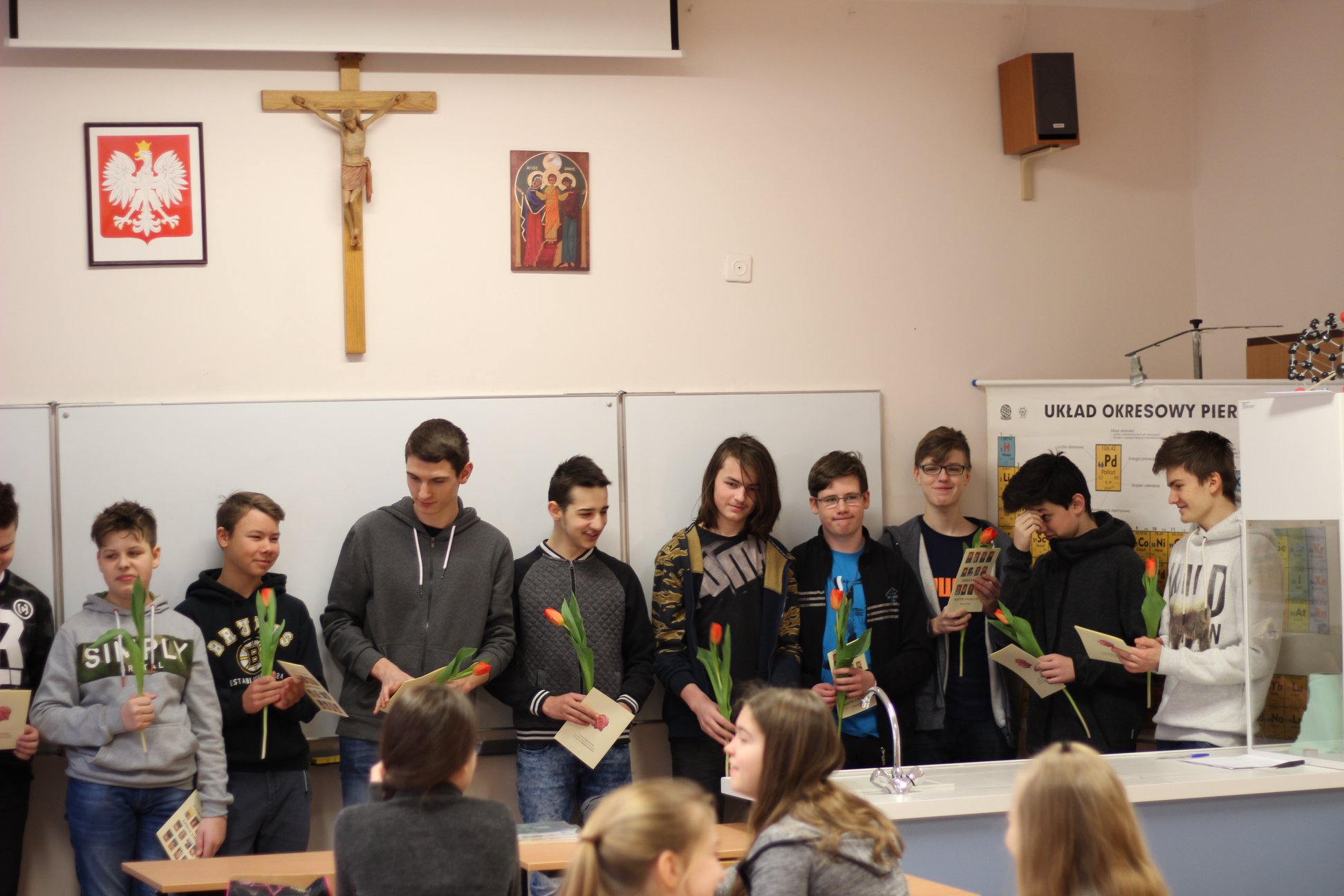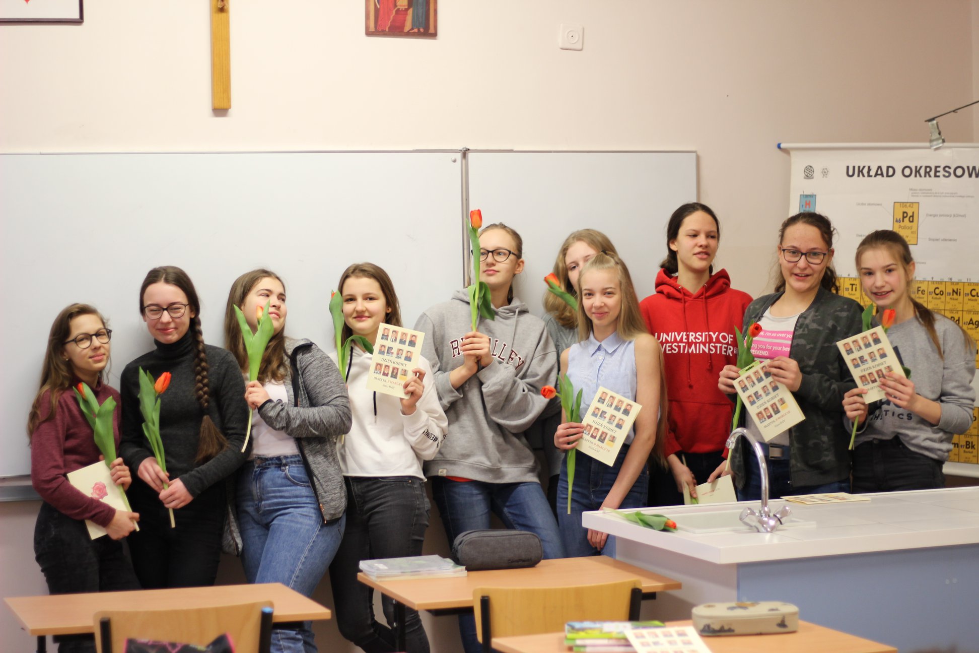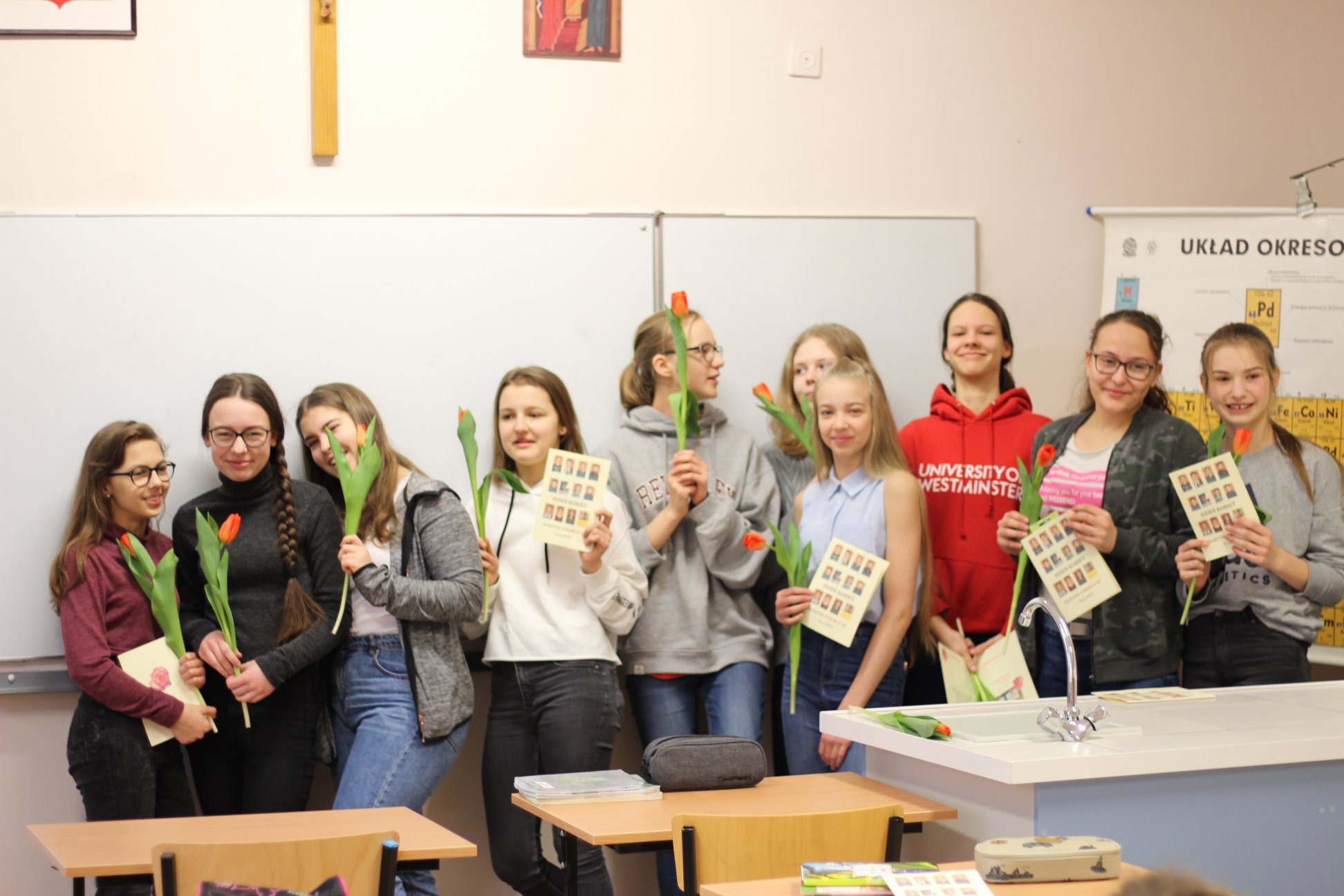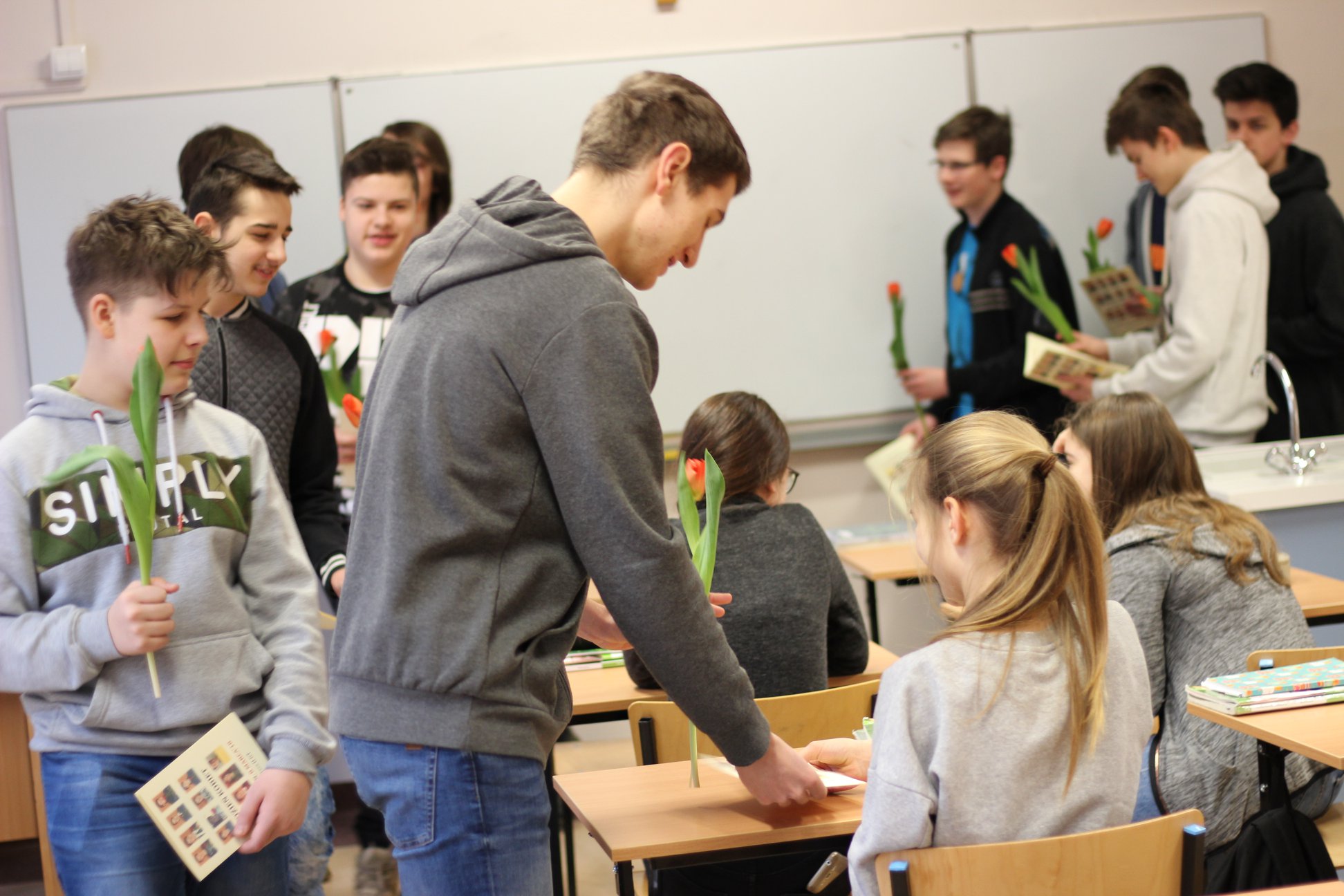 Z okazji Dnia Kobiet (8 marca) uczniowie naszych klasy na różne sposoby próbowały świętować. Były wyjścia do kina, na kręgle, bilard, wspólna pizza. Od rana małe miłe zamieszanie i wszędzie pełno kwiatów.