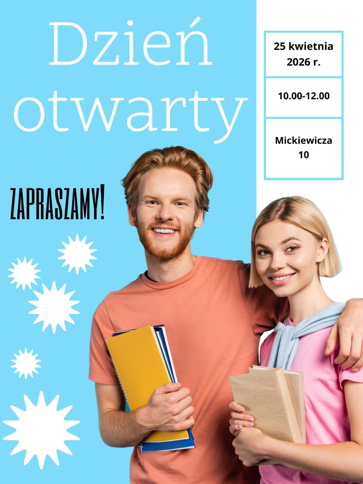 Serdecznie zapraszamy uczniów klas ósmych oraz ich rodziców na Dzień Otwarty, który odbędzie się 25 kwietnia w godzinach 10:00–12:00.