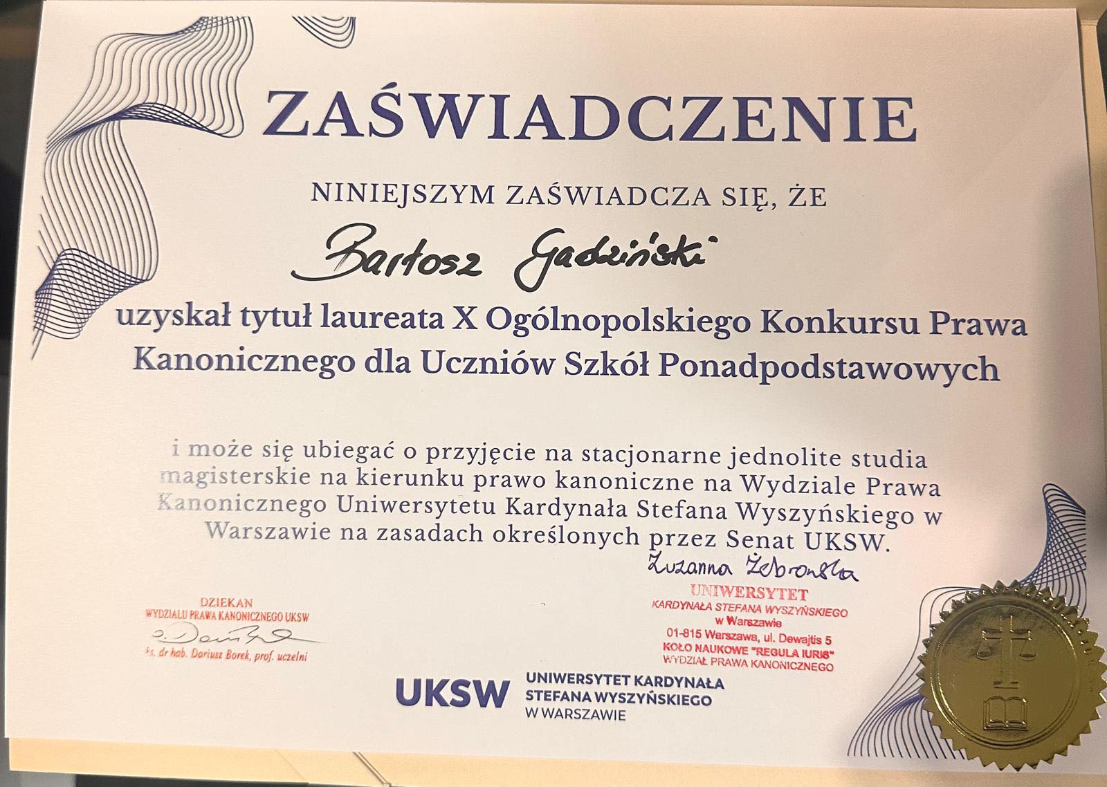 Z ogromną dumą informujemy o sukcesie Bartosza Gadzińskiego, który został laureatem X – jubileuszowej edycji Ogólnopolskiego Konkursu Prawa Kanonicznego 📚